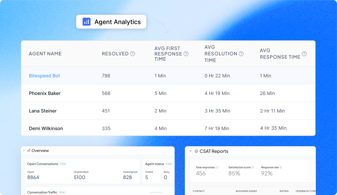 Track conversation volume, monitor unattended, open, and unassigned chats, and view real-time agent performance and workload.